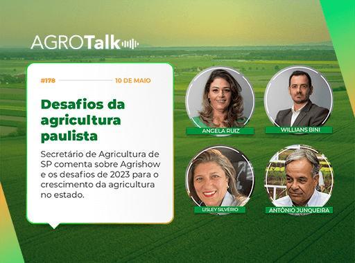 Durante a semana da Agrishow 2023 – 28ª Feira Internacional de Tecnologia Agrícola, a jornalista Angela Ruiz recebeu o secretário de Agricultura de São Paulo, Sr. Antônio Junqueira, a assessora Lisley Silvério e o meteorologista da Climatempo Willians Bini no estúdio podcast Agrotalk.